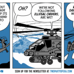 Panel 1: The first helicopter says to the other, "Why the long face, AH-64 Apache attack helicopter?" The other one says "I'm worried about this plan to invade Venezuela, kidnap its leader, and then hand control over to American oil companies."