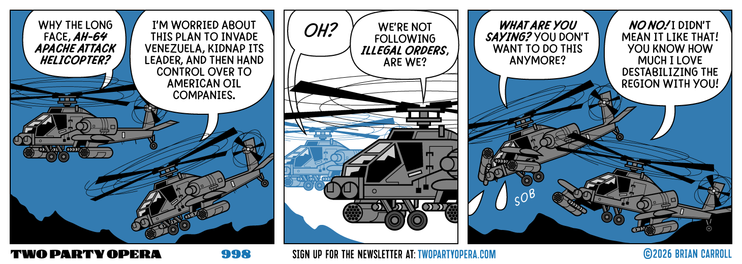 Panel 1: The first helicopter says to the other, "Why the long face, AH-64 Apache attack helicopter?" The other one says "I'm worried about this plan to invade Venezuela, kidnap its leader, and then hand control over to American oil companies."